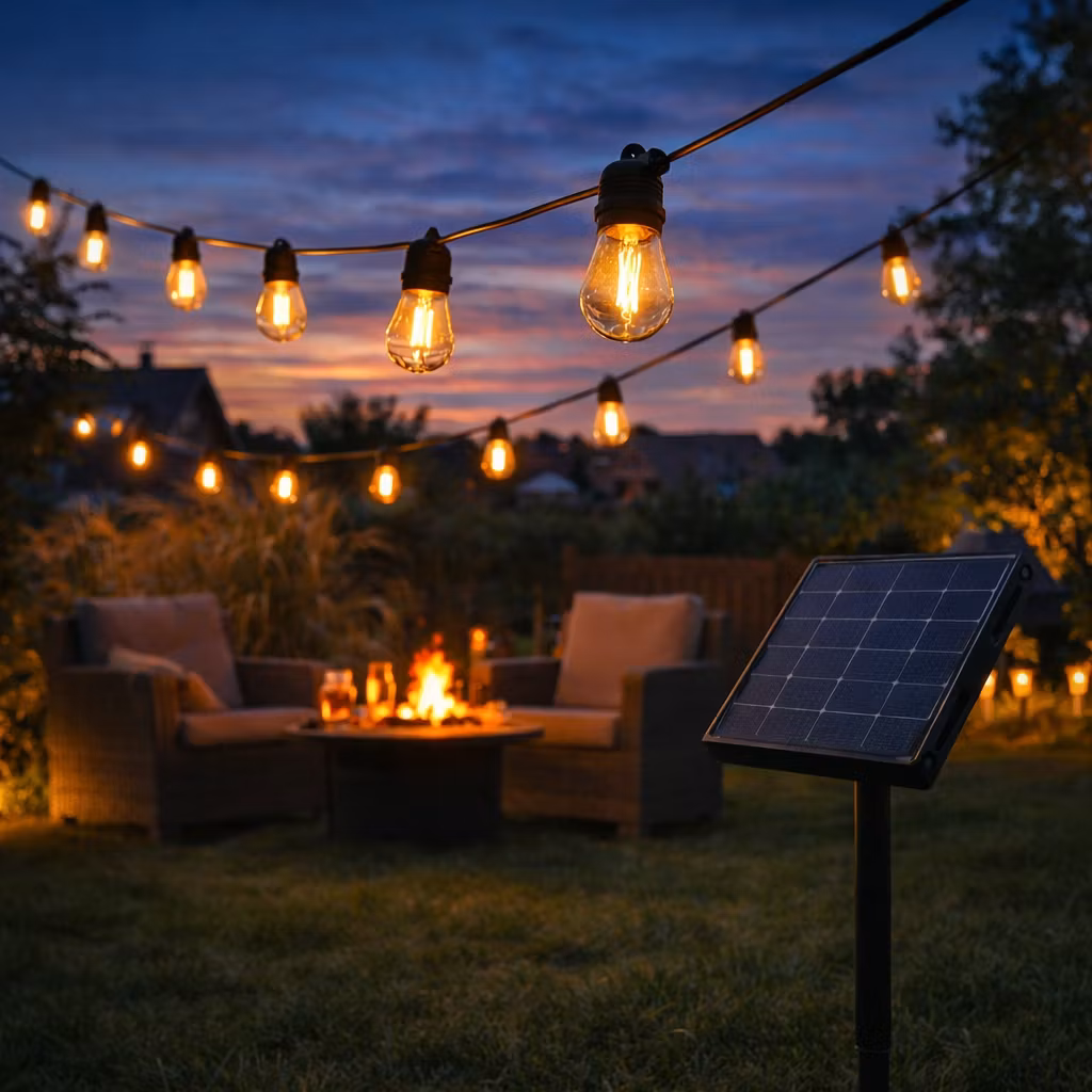Kraftfuld lyskæde med solceller og solpanel på 10-20 m med 10-30 udskiftelige LED-pærer - solcellebelysning.