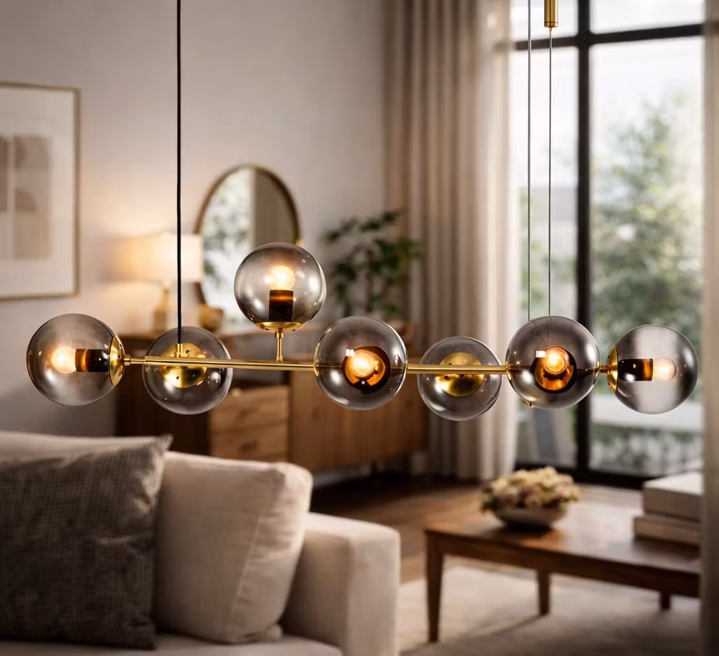 En chic och lekfull ljuseffekt med lyxiga glaskulor. Denna designade taklampa har en trendig design med en smal stång med luftigt glasarbete och sju rökglaskulor. Kulorna är festligt draperade runt stången; en design som skapar en chic utstrålning i både en tidlös och modern interiör. Särskilt på minimalistisk inredningsstil är taklampan en riklig tillägg och en verklig blickfångare. Tänk på den eleganta effekten ovanför ett matbord, köksbar eller sittgrupp. Dessutom tillför denna designade taklampa även i sovrummet en lyxig detalj som omedelbart skapar värme och atmosfär.