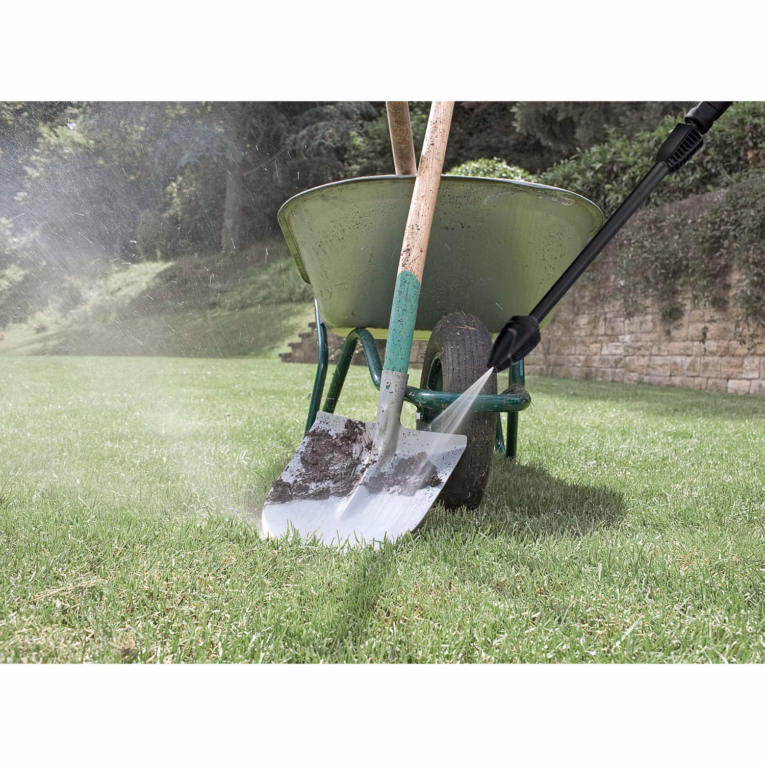 Den praktiska tvättmedeltanken förenklar användningen av tvättmedel. Tack vare Easy Connect-systemet kan högtrycksslangen snabbt och enkelt klickas i och ur enheten och pistolen som möjliggör en smidig förvaring. Maskinen är utrustad med två större hjul som gör att du lätt förflyttar maskinen till arbetsområdet.