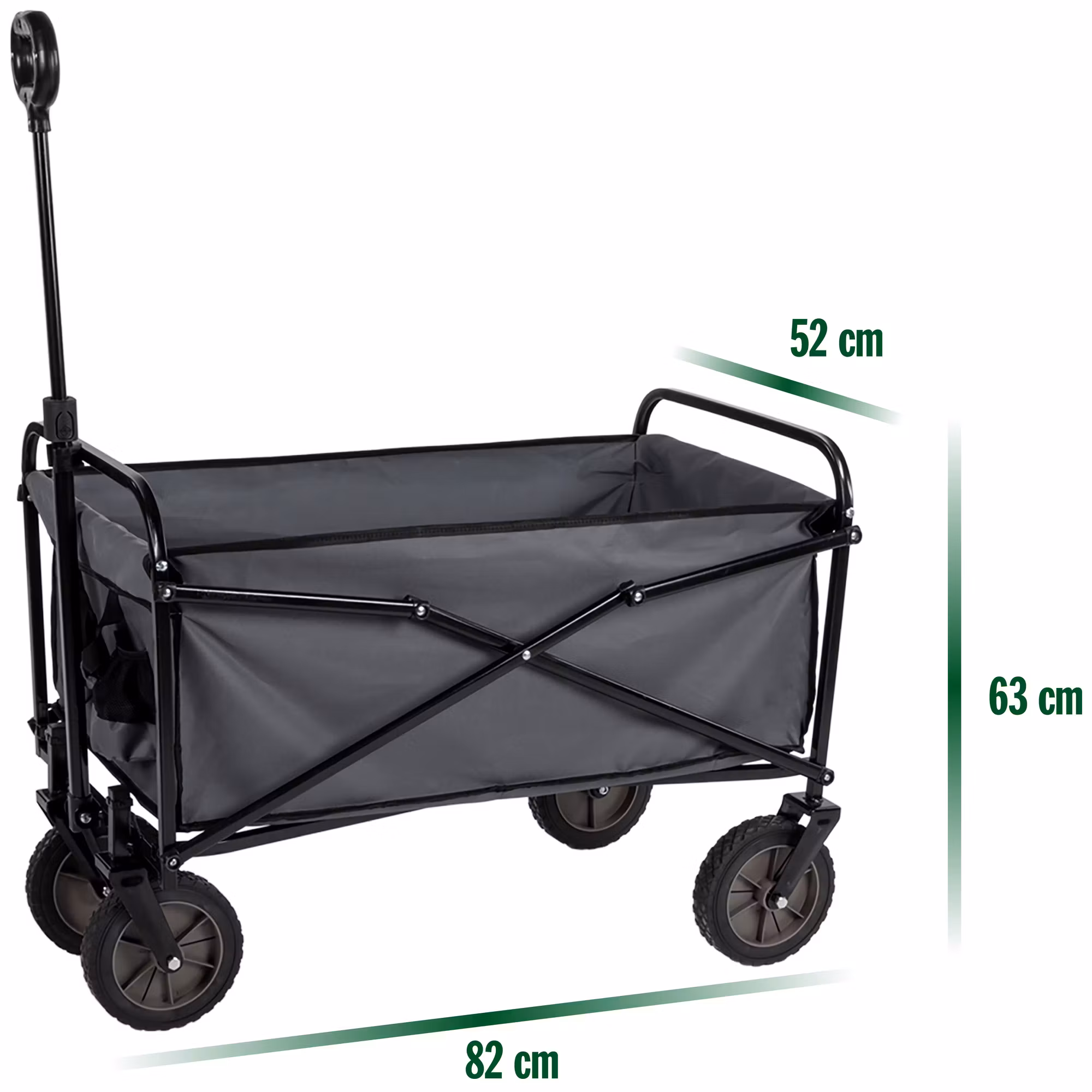 Väl utfälld kan den ta vikt upp till 70kg och storlek på 82 x 63 x 52cm. Hjulen är vridbara och har en ram av stål.