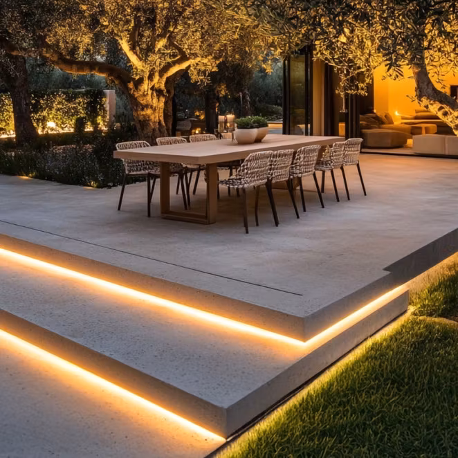 Altan & uteplats – snyggt ljus längs räcke, trappsteg eller under bänkar