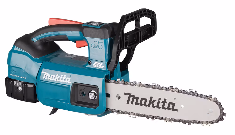Makita DUC254 är en smidig men stark 18V LXT batteridriven topphandssåg med kolborstfri motor, framtagen för beskärning och kapning av grenar där du vill ha hög kontroll och låg vikt. Den har en hög kedjehastighet på upp till 24 m/s för snabb kapning och en praktisk ”torque boost / thick branch mode” som tillfälligt ger extra kraft vid grövre grenar.
